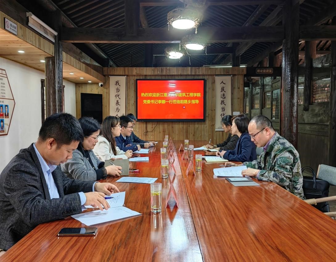 调研团一行首先来到党建共同体单位缙云县前路乡。乡党委书记胡文君、乡长巫海波感谢学院和缙云研究院对前路在红色文化传承、“茭麻共生”项目等方面的支持,介绍了前路乡中国重要农业文化遗产“茭白-麻鸭共生系统”和温泉项目等乡里重点工作的建设情况,希望学院发挥专业优势,在乡村规划、乡村文化、遗产保护等方面给予智力支持,促进前路的建设发展。