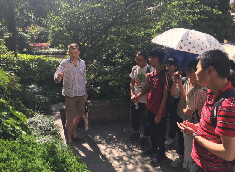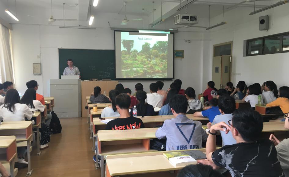 讲座分为理论讲解与实践指导两部分。课堂上,Armitage 先生为大家介绍了RHS Wisley 花园各个部分的设计和植物布局,讲解英国花园的设计理念,让同学们感受到英国自然式风景园林的魅力所在。室外实践环节,Armitage 先生带领同学们走进校园,实地讲解植物的分类和生态特性,与同学们展开互动交流,探讨中英植物设计差异,以及植物应用特点。