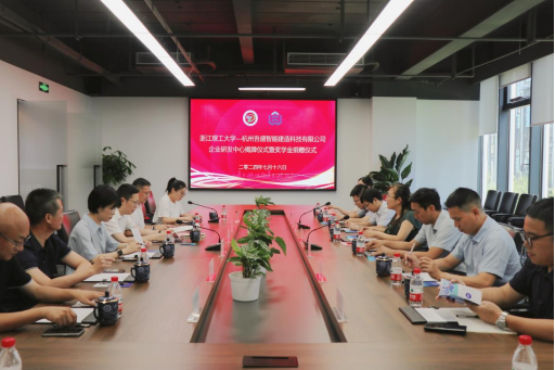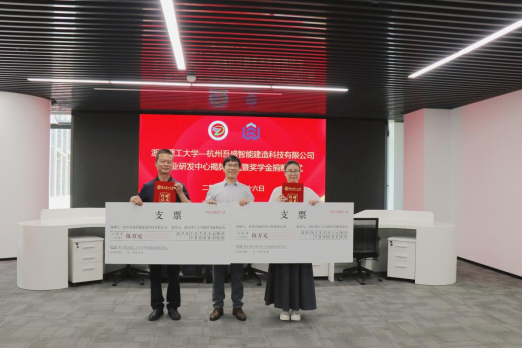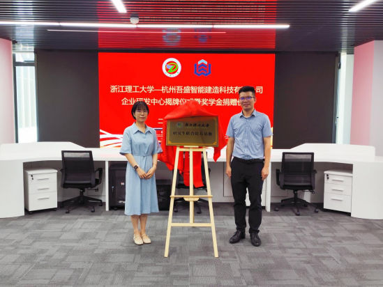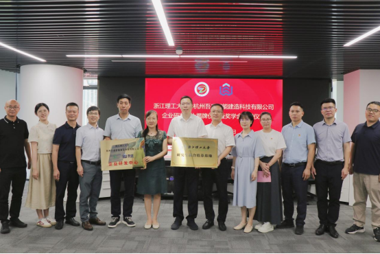 与杭州吾盛智能建造科技有限公司(下文简称“吾盛公司”)企业研发中心举行签约暨奖学金捐赠仪式。学院党委书记李娜、校对外联络办公室副主任应黎君、校产业技术中心副主任王顺利、副院长刘勇、学院党委副书记郑磊,萧山区北干街道党工委书记丁裕、风情街道科创社区书记陈婕,吾盛公司总经理孙杰、法人代表李兵、来锦紫、市场总监董振凯参加此次仪式。