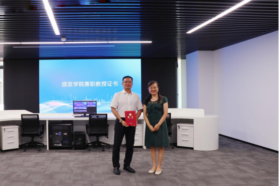 学院党委书记李娜为吾盛公司总经理孙杰颁发学院兼职教授证书。