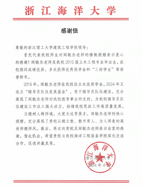 近日,浙江海洋大学发来感谢信,对蘑菇视频 闻敏杰老师的慷慨捐赠表示衷心感谢,对我校以德立教、教书育人、为人师表的师德师风表示肯定。